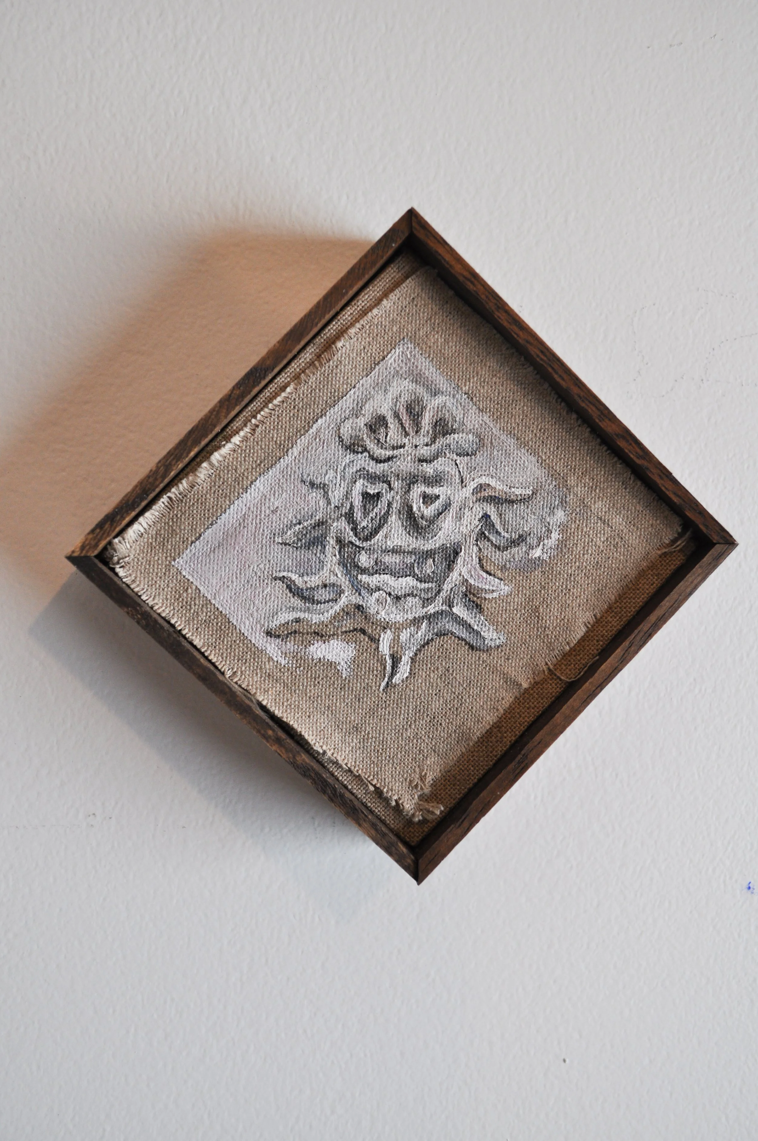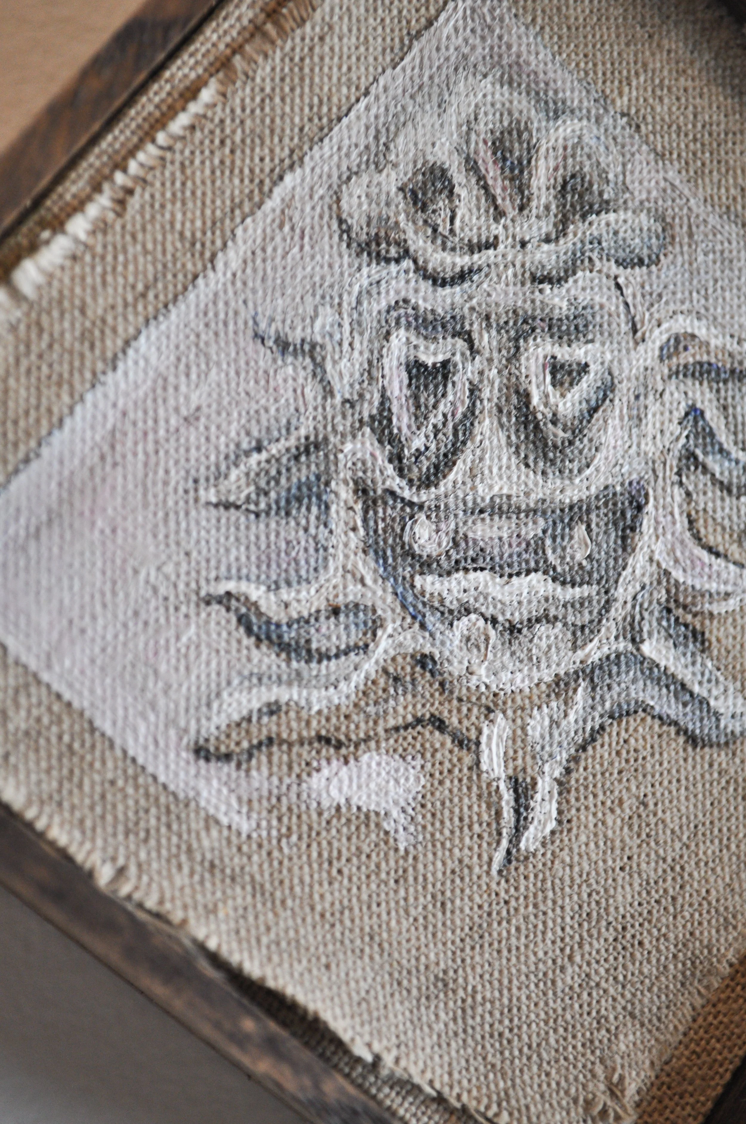 This was the first piece I created while traveling, away from my studio. I had brought a small piece of canvas with me and started painting a tile I saw in the street. It had a strange face, a little odd, but with heart-shaped eyes that caught my attention. At some point, the bar I was sitting at began to close and I had to leave. I decided to leave the work just as it was in that moment. The interruption became part of the piece, and I now see it as finished exactly the way it is.